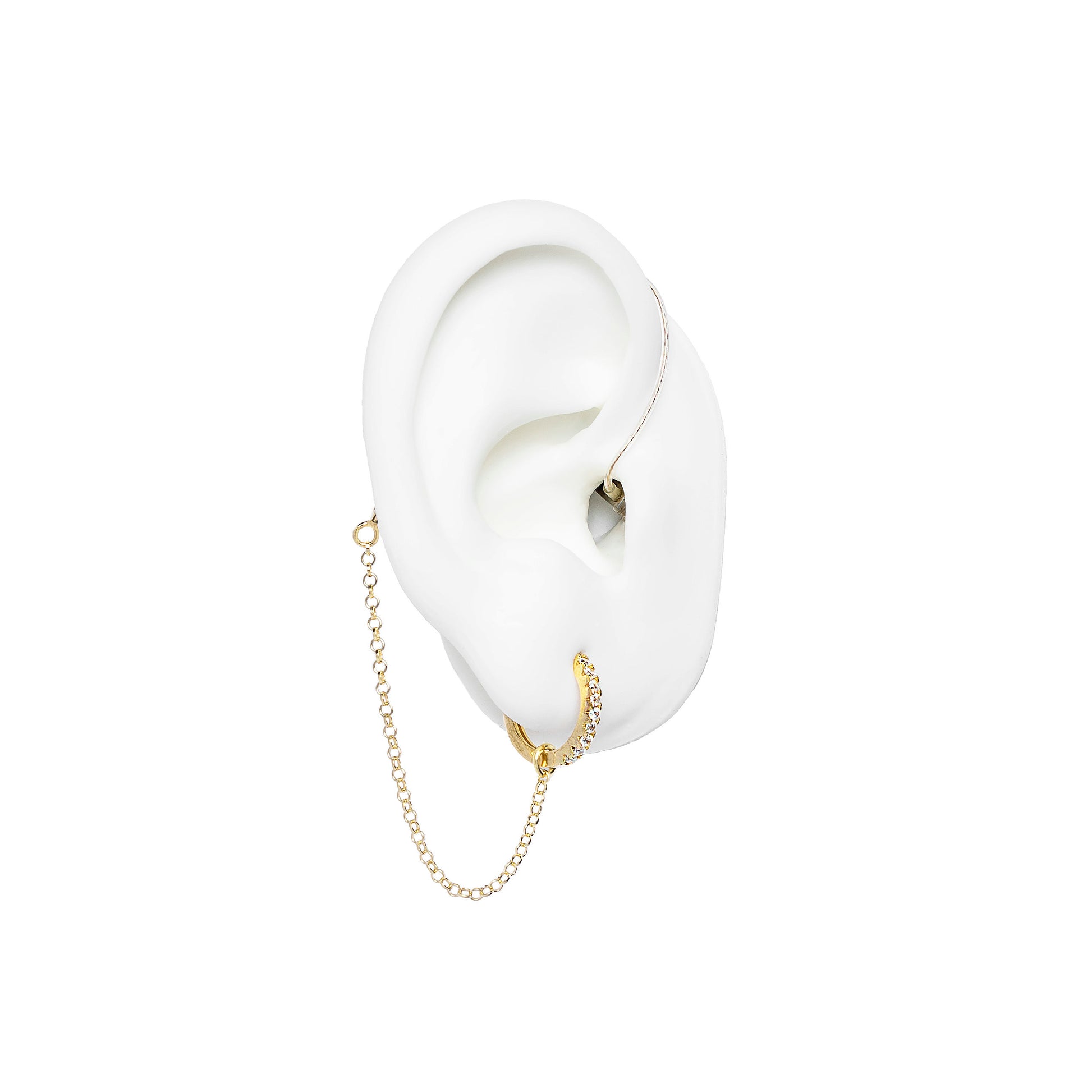 Mileena (formerly Shiny Hoop) earring with a 6 cm safety chain. Available in silver or gold.