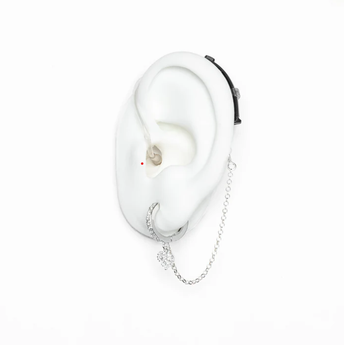 This gorgeous silver hoop made of platinum plated brass is complemented with a bright cubic zircon heart – simply stunning! Lead, cadmium and nickel free. The zircon heart, chain and lock are silver 925. Length of chain is 6 cm. This is a brand new design to the collection and perfect for gifts or everyday wear! Excellent for retention and also to add style to your hearing device!