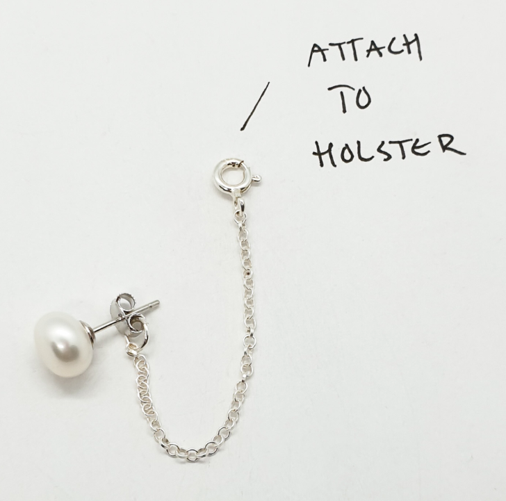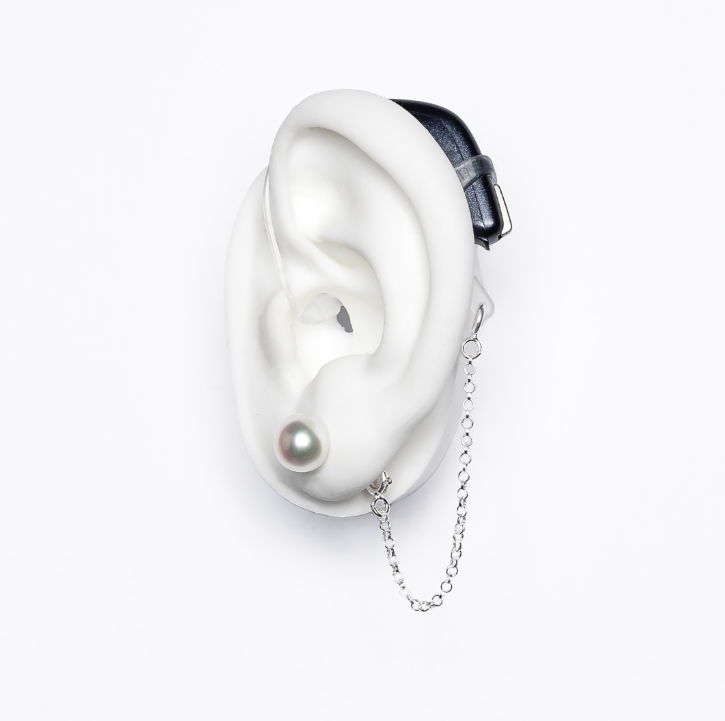 Pearly Day is silver hearing aid jewelry with a pearl earring and silver safety chain. All metal parts are 925 sterling silver. The safety chain is 5.5 cm in length. Available in silver or