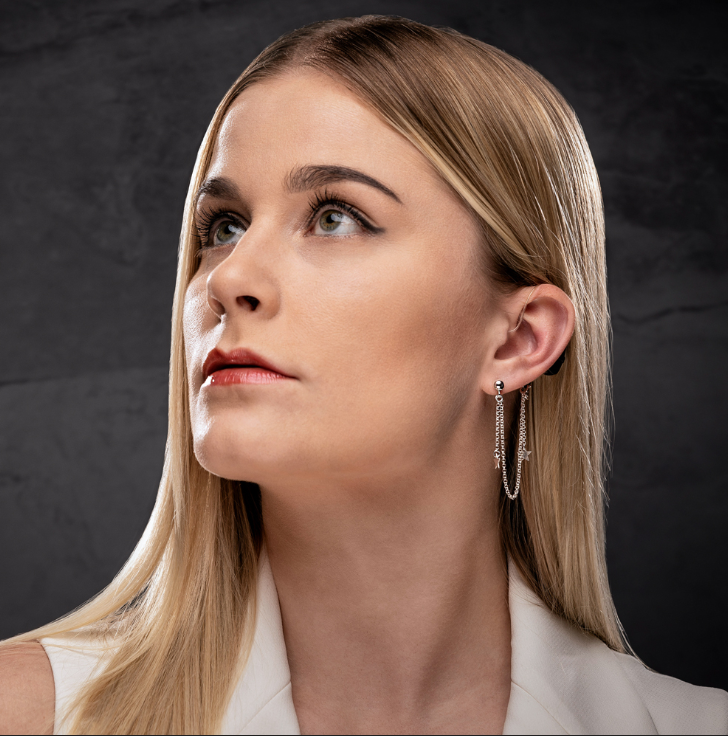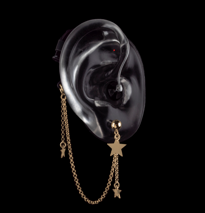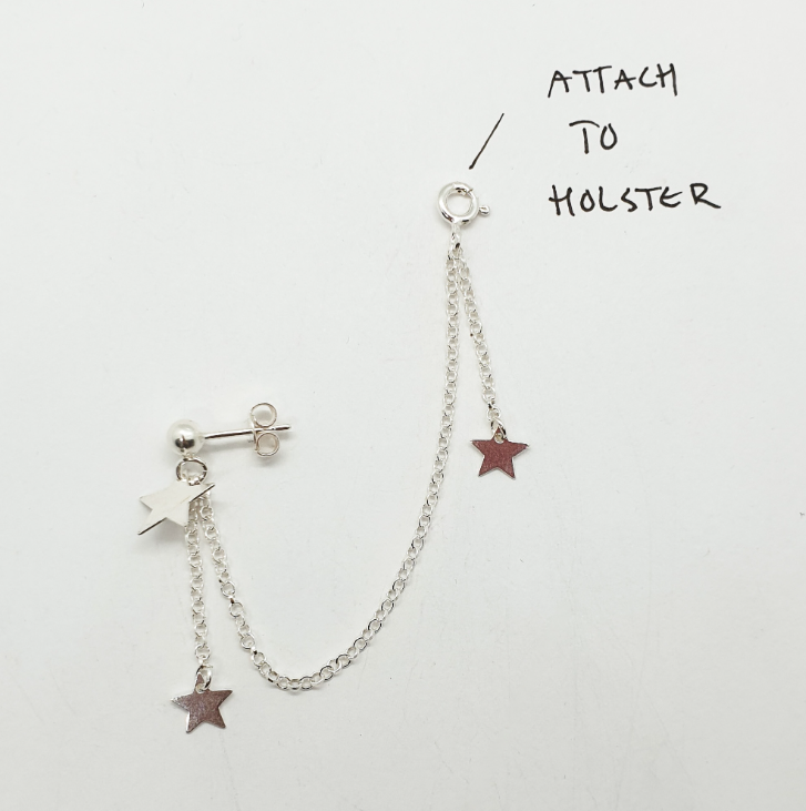 Riley Stars is a silver Deafmetal safety chain with three stars, dangling from a silver stud and two chains.